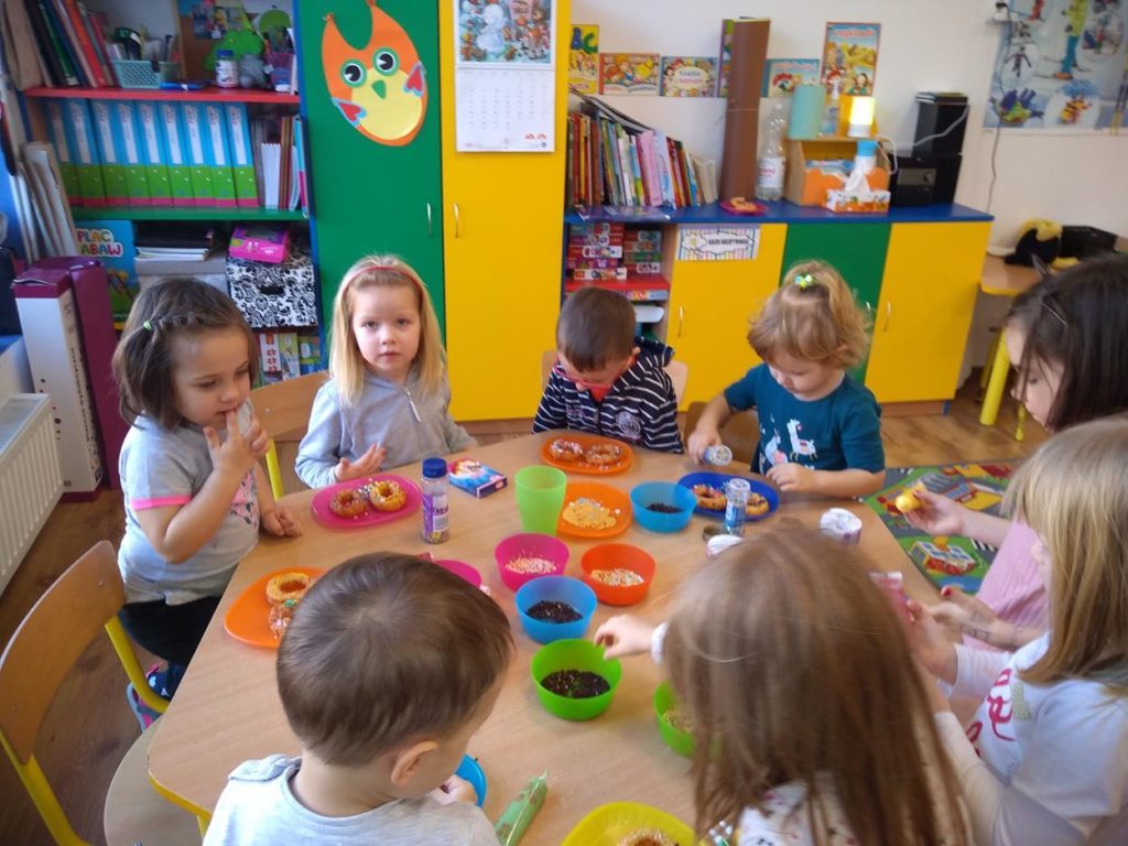 W czwartek słodko bawiliśmy się ozdabiając słodkie pączki i pączuszki. Smakowaliśmy i próbowaliśmy różnych dodatków i posypek. Była pyszna zabawa.