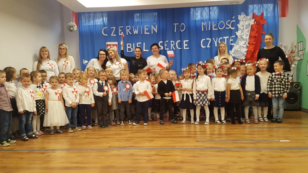 Przedszkolaki również uroczyście obchodziły rocznicę odzyskania Niepodległości przez Polskę. W dniu 9.11.2018r. o godz. 11.11 przyozdobione w barwy narodowe, kotyliony, kokardy i chorągiewki wspólnie odśpiewały Hymn Polski.